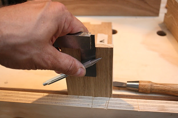 So marking the finges with the cutting gauge and in this way avoid tear out when removing the wood.